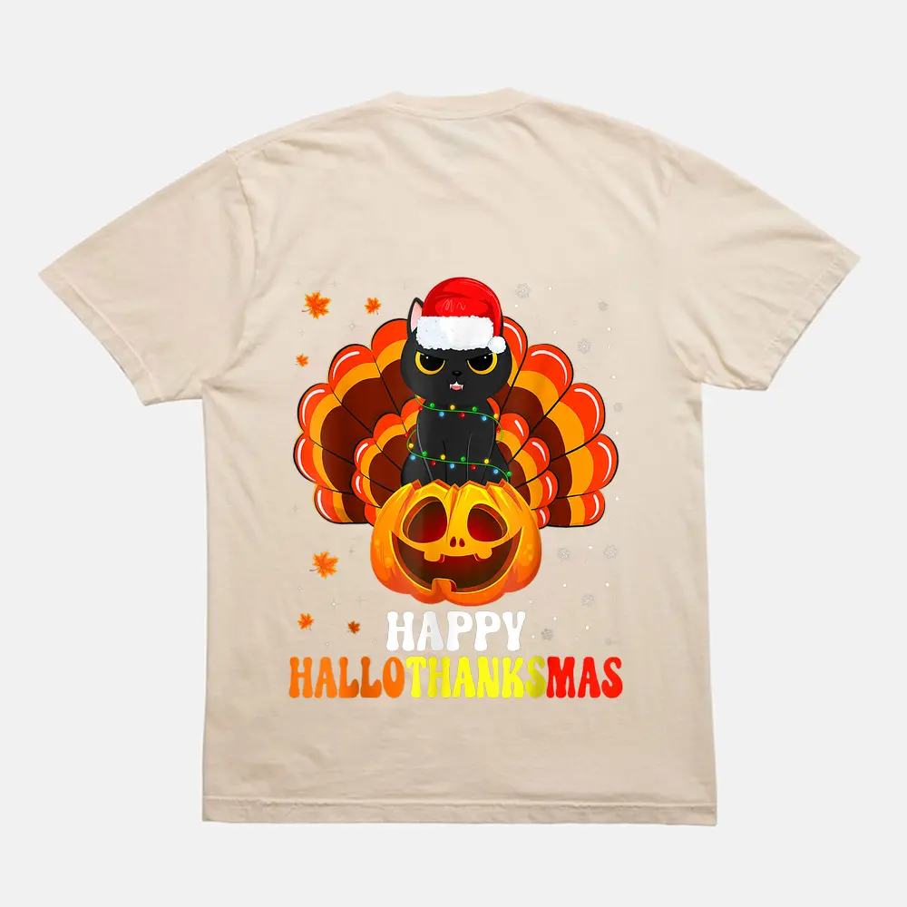 Black Cat Happy HalloThanksMas T-Shirt – Cream