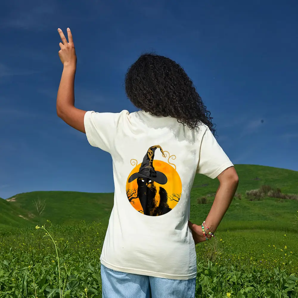 Black Cat Moon Funny Halloween Costume Witch Hat And Moon T-Shirt – Cream