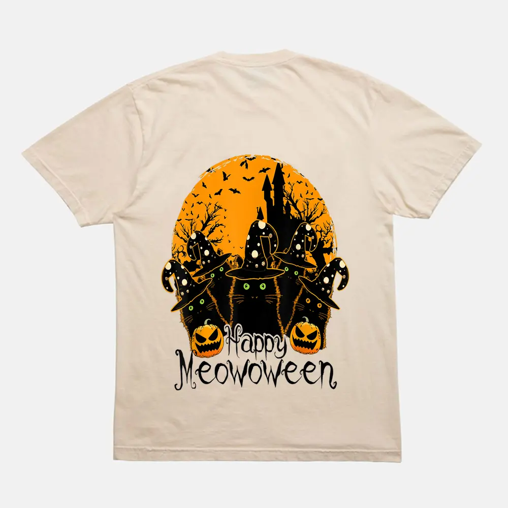 Black Cat Witch Hat Halloween Costume Happy Meowloween Funny T-Shirt – Cream