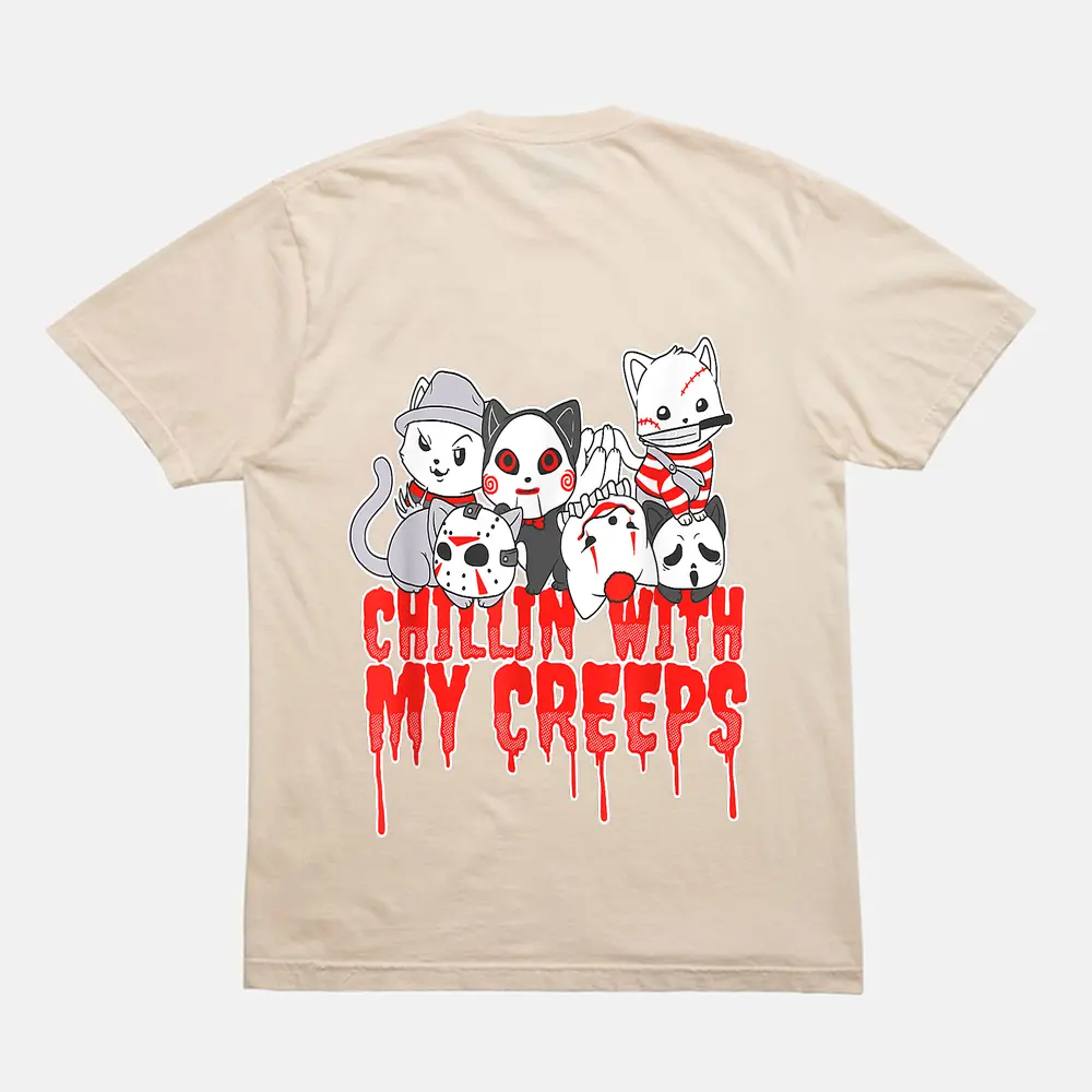 Chillin With My Creeps Cat Horror Serial Killer Halloween T-Shirt – Cream
