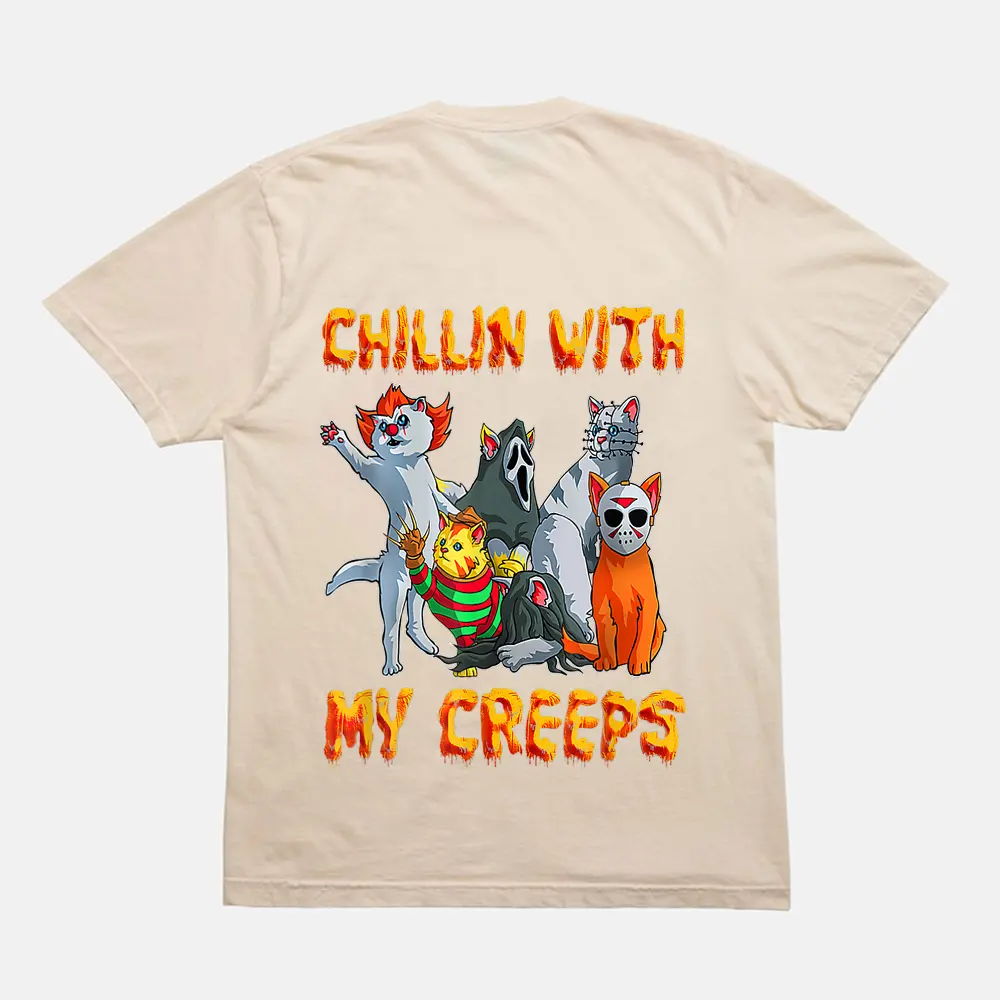 Chillin With My Creeps Funny Cat Horror Movies Serial Killer T-Shirt – Cream