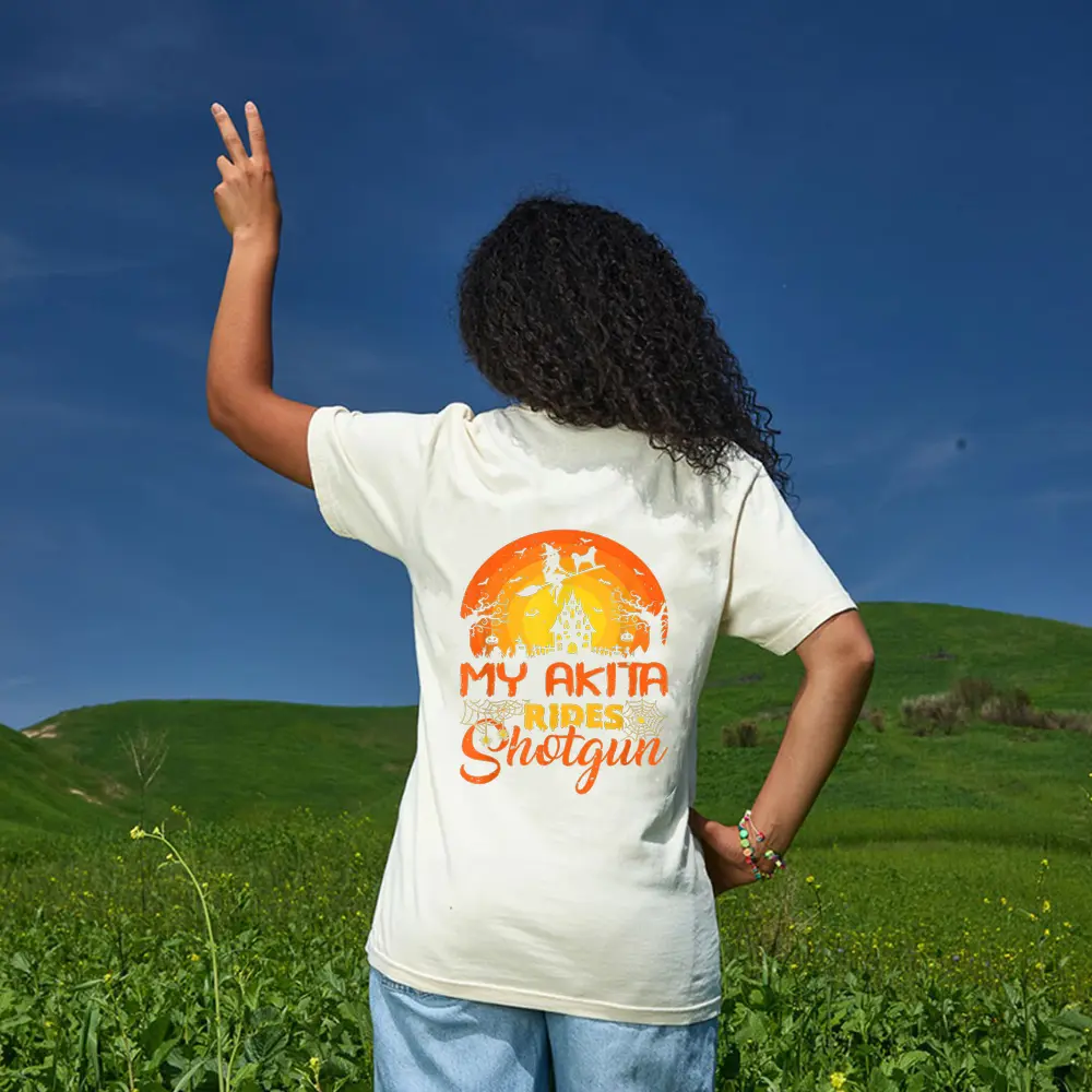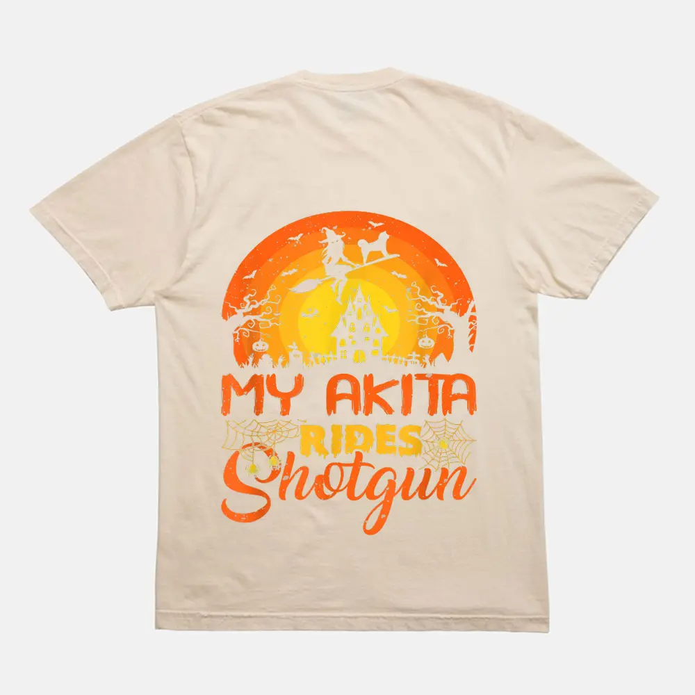 Vintage Sunset My Akita Dog Ride Shotgun Halloween T-Shirt – Cream